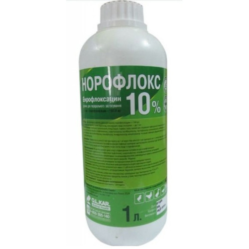 Treatment of chickens, broilers, turkeys, geese, ducks with infectious avian rhinitis, necrotic enteritis, staphylococcosis, streptococcosis, colibacillosis, pasteurellosis, salmonellosis, colibacillosis, campylobacteriosis, hemophilia, pseudomonosis, mycoplasmosis and other diseases caused by microorganisms sensitive to enrofloxacin.