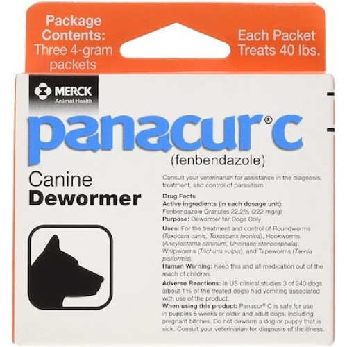 Panacur C (fenbendazole) is a broad-spectrum parasiticide used to treat hookworms, roundworms, tapeworms, and whipworms in dogs. It is also used by veterinarians to treat other parasites. For: Dogs (6 weeks of age or older)